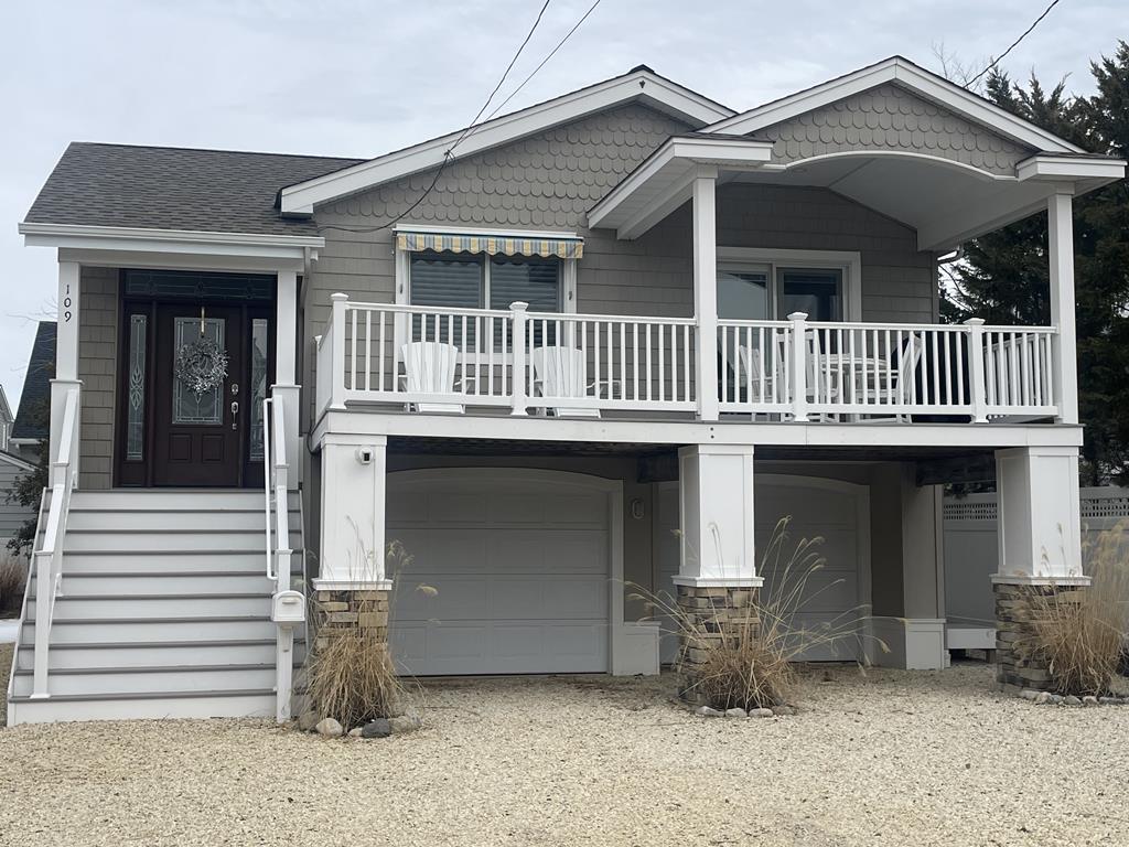 Bayside 3-bedroom, 2-bath home for rent in Beach Haven Terrace. Numerous upgrades for 2026 include beautifully renovated bathrooms, new furnishings, and fresh interior paint throughout. Dining table pictured will be replaced with a table seating 6. Amenities include central air, an enclosed outdoor shower, and a spacious front deck offering both open and covered areas with an awning—perfect for relaxing in sun or shade.